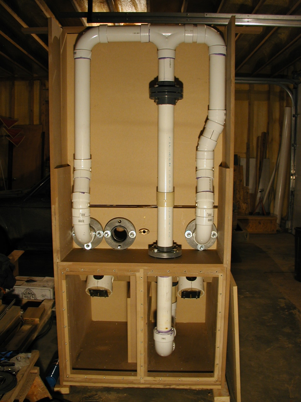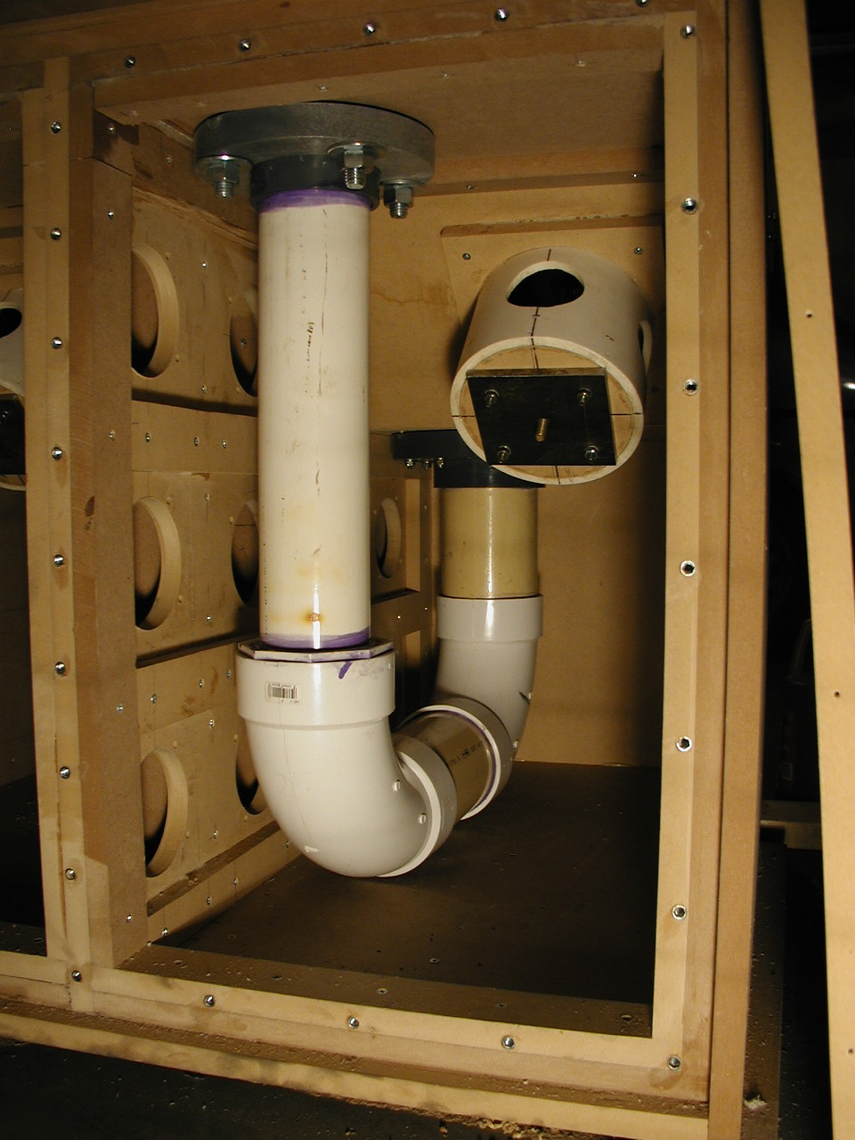 This is the motor suction side, there will be four motors open and three pairs of two with some sort of check valves on the suction side of the motor. Right now I'm thinking aobut 2" sump pump check valves on PVC pipe stubs coming out of the motor suction board you see in this photo. The start of bi-directional averaging elliptical pitot tubes.
